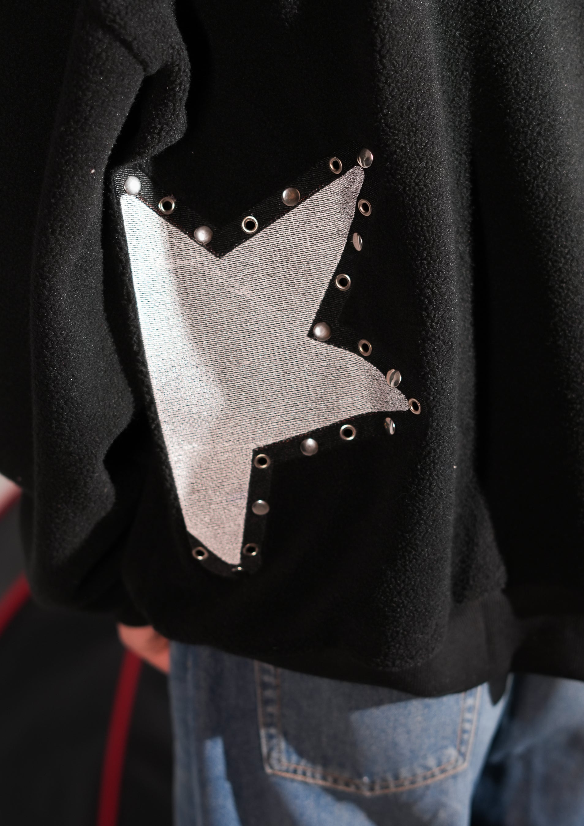 Soft, warm, and built with character. This black sherpa half-zip features two silver embroidered stars around the pocket and mixed rivet detailing along the boundary subtle, but with attitude. The plush texture and relaxed silhouette make it the perfect mix of comfort and statement.