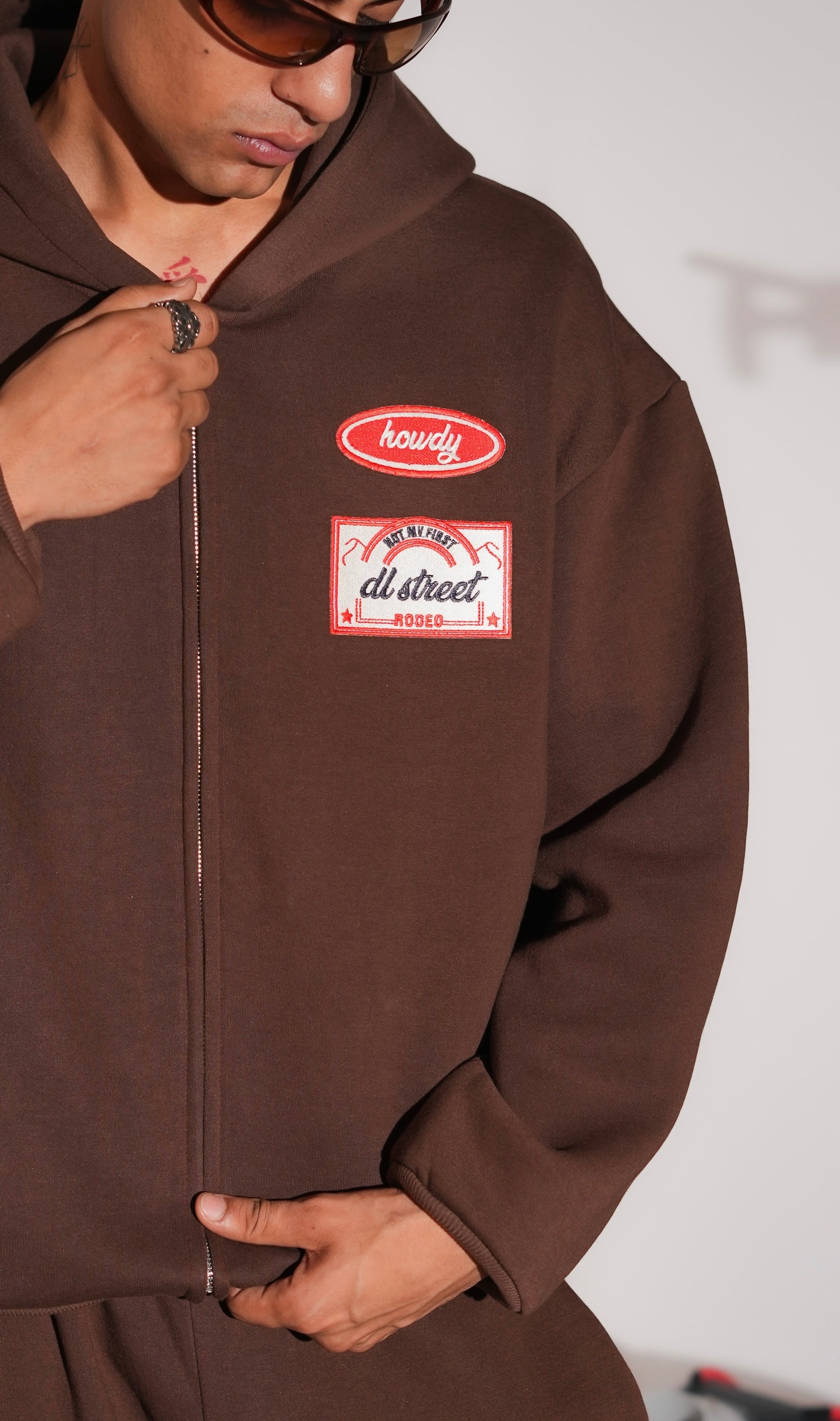 The zipper features a slightly dropped shoulder for a relaxed fit. Embracing the concept of core essentials, the back features a bold ‘Not My First Rodeo’ embroidered at the back; with Rodeo stitched in a rope-style embroidery. Rivets on the pockets add a touch of edge.